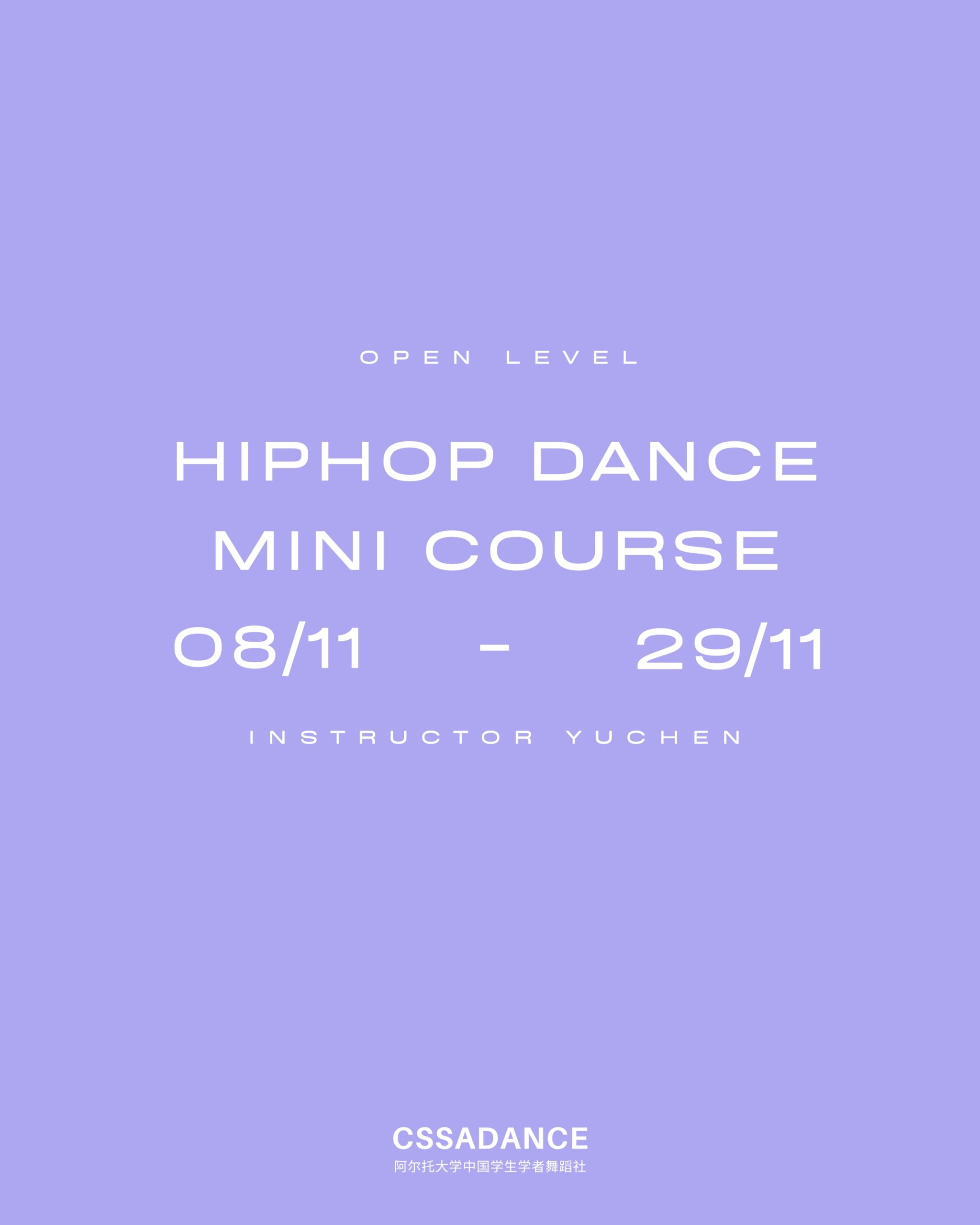 Welcome to CSSADANCE mini dance course series 2025! Starting from the 8th of November, with 4 sessions for the course, this Hiphop dance mini dance course is instructed by our new CSSADANCE instructor YUCHEN!