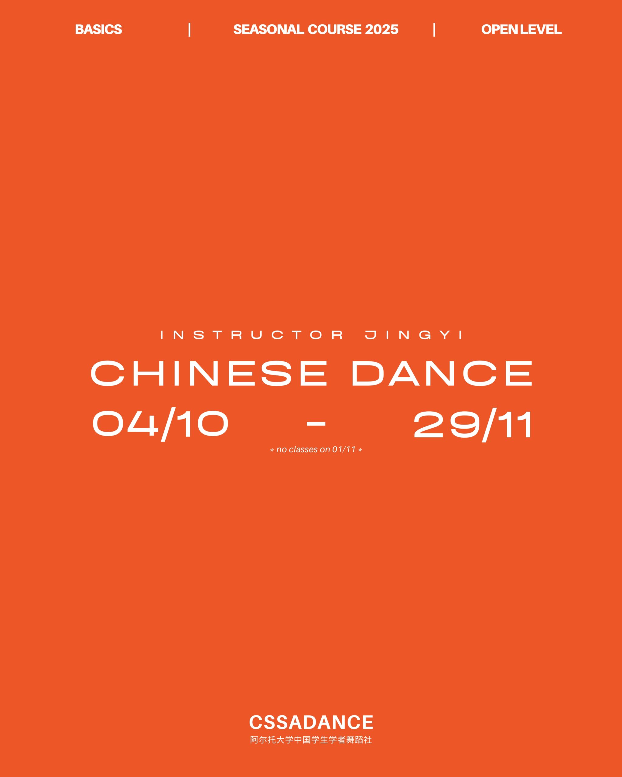 Welcome to CSSADANCE seasonal dance course series 2025! Starting from the 4th of October, with 8 sessions for the course (no classes on 1.11), this Chinese dance seasonal dance course is instructed by our resident CSSADANCE instructor JINGYI!