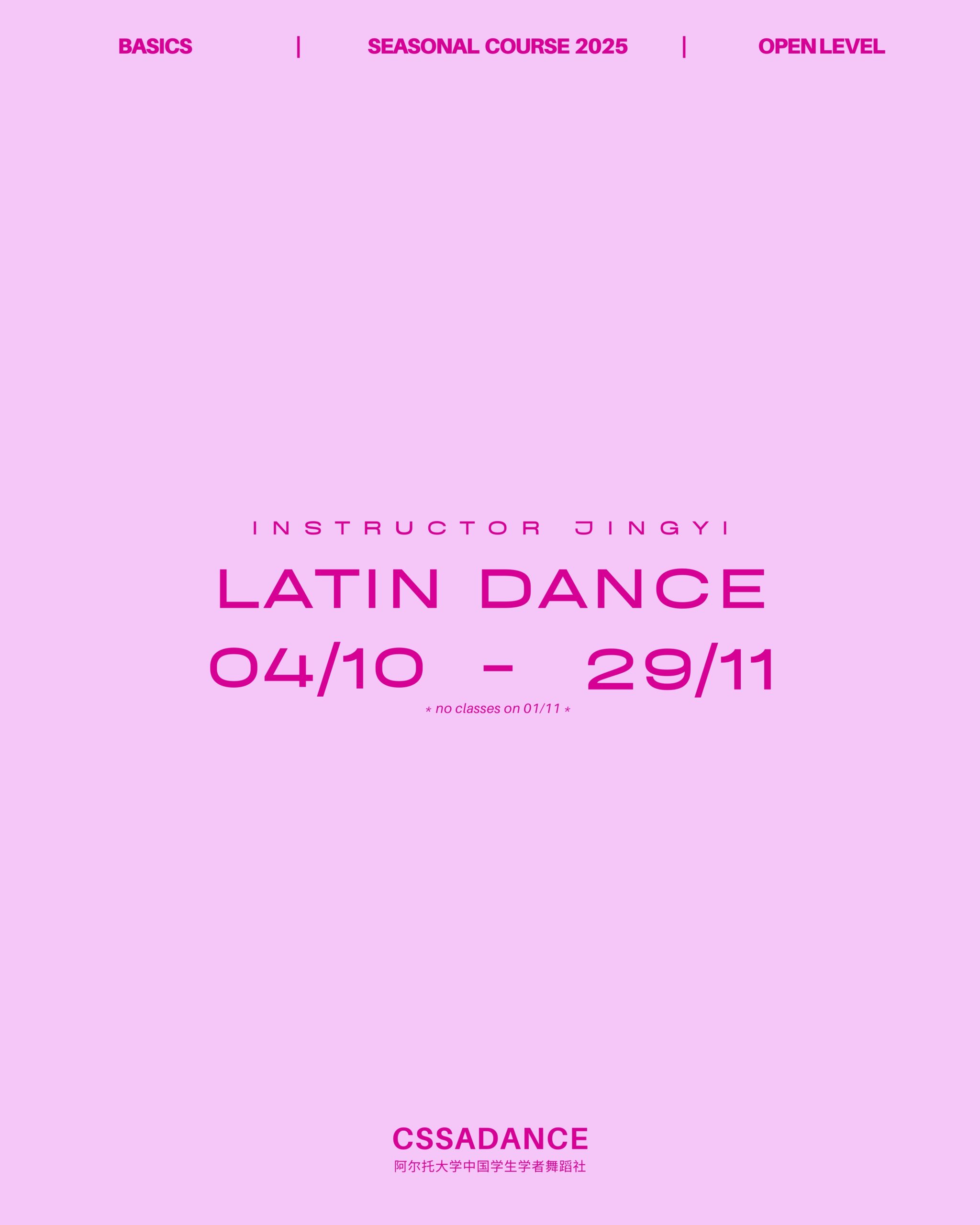Welcome to CSSADANCE seasonal dance course series 2025! Starting from the 4th of October, with 8 sessions for the course (no classes on 1.11), this Latin dance seasonal dance course is instructed by our resident CSSADANCE instructor JINGYI!